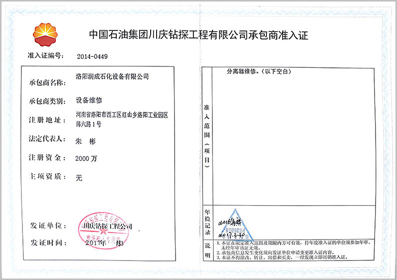 • ? 中國石油集團(tuán)川慶鉆探工程有限公司承包準(zhǔn)入證