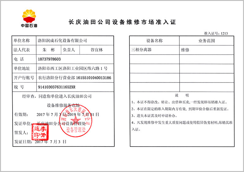 • ? 長慶油田公司設(shè)備維修市場準(zhǔn)入證