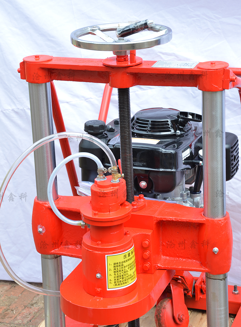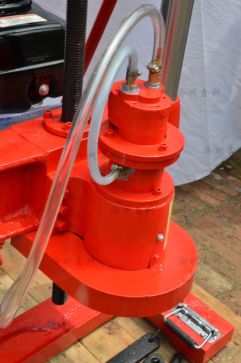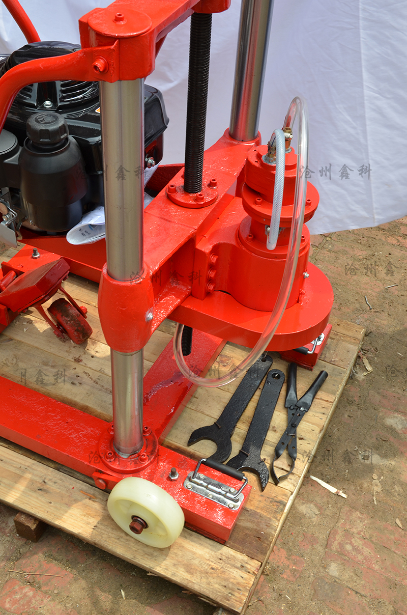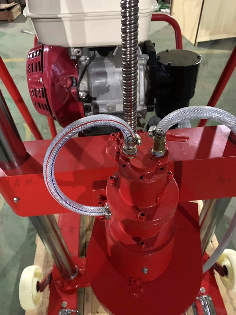 5、開(kāi)孔:以上作業(yè)做好后,即可開(kāi)孔作業(yè),裝上鉆頭,起動(dòng)汽油機(jī)(詳情見(jiàn)汽油機(jī)用戶(hù)手冊(cè))把進(jìn)水管放入水桶內(nèi),水桶要提到高出水泵位置,然后手捏氣襄把水吸入水泵,水泵上水后把水桶放在地面即可。油門(mén)調(diào)至最大,開(kāi)始輕搖給進(jìn)手柄,使鉆頭緩慢接觸地面。開(kāi)孔要訣:先給水后鉆進(jìn),給進(jìn)速度要慢,鉆壓要小。嚴(yán)禁無(wú)水作業(yè),以免燒壞鉆頭和水封。