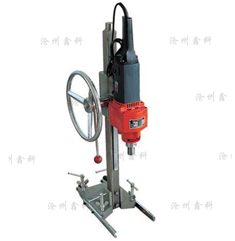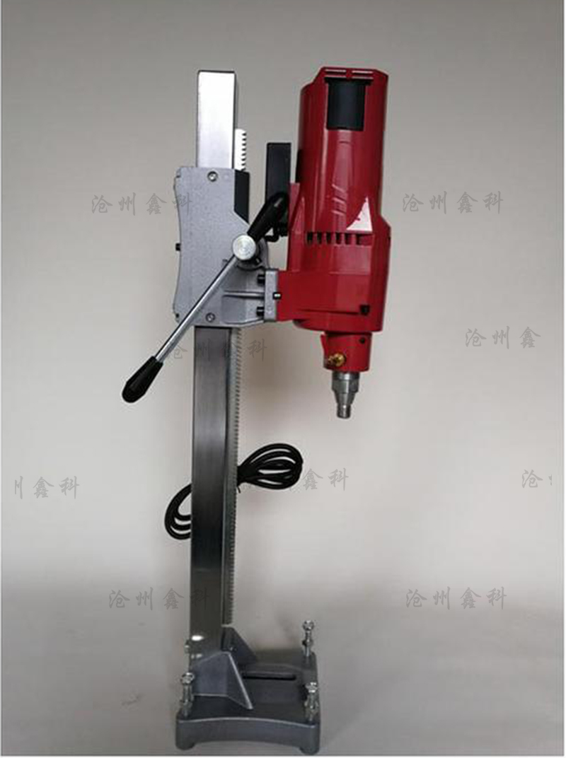 4、安裝:鉆頭對(duì)孔位后,把三個(gè)行走輪搬起,讓底座落到地面。打小孔且混凝土強(qiáng)度不高時(shí),則依靠鉆機(jī)的自身重量就可將鉆機(jī)固定,若打的孔徑較大,鉆機(jī)自身重量不能穩(wěn)住鉆機(jī)時(shí),可在底盤(pán)上放置重物(如砂袋、鐵塊、混凝土塊等)固定或打兩個(gè)膨脹螺栓加上壓桿(如槽鋼等)來(lái)固定鉆機(jī),鉆機(jī)固定要牢靠,不得搖晃,否則鉆孔作業(yè)無(wú)法正常進(jìn)行。